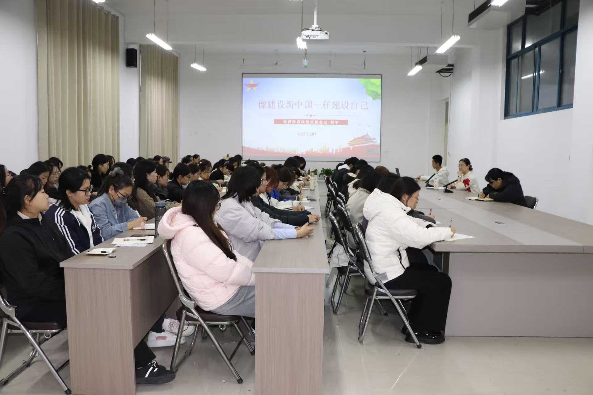 仪式结束后,郭宁以《像建设新中国一样建设自己》为题讲授开班第一课。她强调,个人是国家的微观缩影,新时代青年应借鉴国家建设的成功经验规划个人成长,以建设者的自觉夯实生存技能、锤炼自信品格、坚守做人底线、保持开放心态、科学规划人生、焕新精神面貌、做自己最坚实的靠山意识来锤炼素养。最后,郭宁指出,青年与国家同呼吸、共命运,要以建设新中国的豪情锻造自我,成长为有理想、敢担当、能吃苦、肯奋斗的“超级青年”。