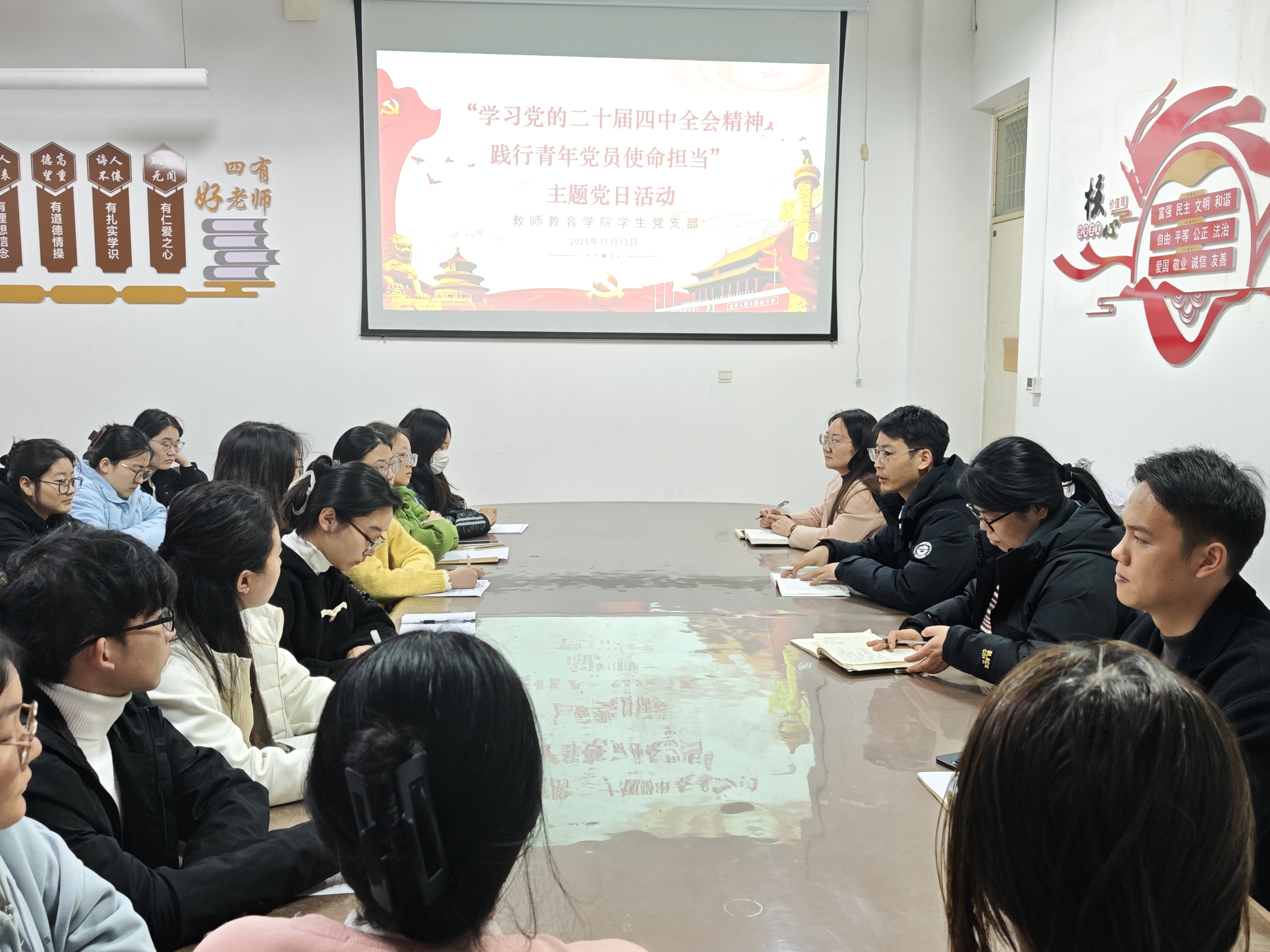11月13日,伟德bv1946官网员工党支部在汉梁楼203教室开展“学习党的二十届四中全会精神 践行青年党员使命担当”主题党日活动。员工第二党支部书记张旖旎主持会议。