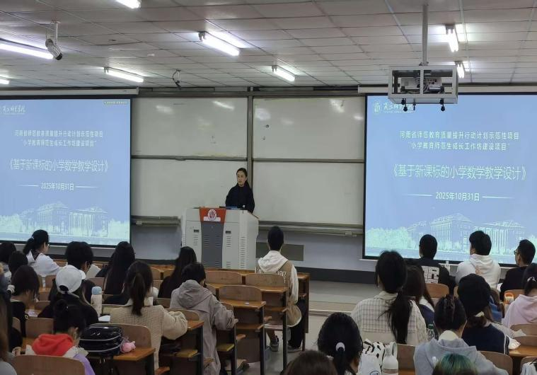 10月31日,河南省师范教育质量提升行动计划师范生成长工作坊示范性项目:小学教育师范生成长工作坊在智圆楼110教室开展《基于新课标的小学数学教学设计》专题讲座。讲座旨在助力师范生精准把握新课标理念、提升小学数学教学设计的专业性与实效性,主讲人是商丘市前进小学的正高级教师、中原名师、河南省教师教育专家李巍,2023级小学教育专业全体员工收听讲座。