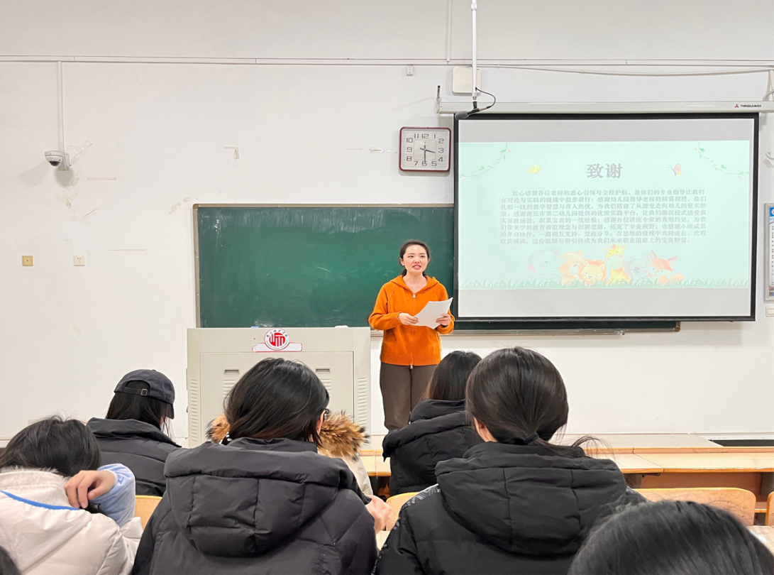 活动的最后,班主任宋泊文老师站上讲台带来暖心总结。宋老师不仅向指导师范生实践的幼儿园一线教师与学院专业教师表达了诚挚感谢,还特地叮嘱同学们,要把见习中的所见所感与专业理论牢牢结合,在“观察—反思—实践”的循环里慢慢打磨教学技能,始终保持对学前教育事业的热爱,用一次次实践积累筑牢自己的专业根基。
